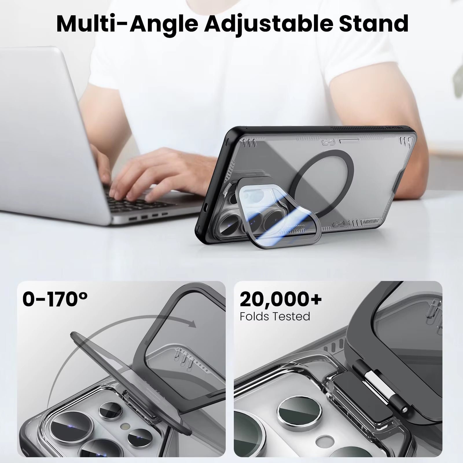 The integrated camera shield does more than just protect your premium lenses. The Upgraded Transparent Camera Cover features a durable hinge—tested for over 20,000 folds—that allows it to flip out and function as an Adjustable Kickstand. Adjust your viewing angle from 0° to 170° for perfect hands-free video calls, streaming, or navigation without exposing your lenses to dust or fingerprints.